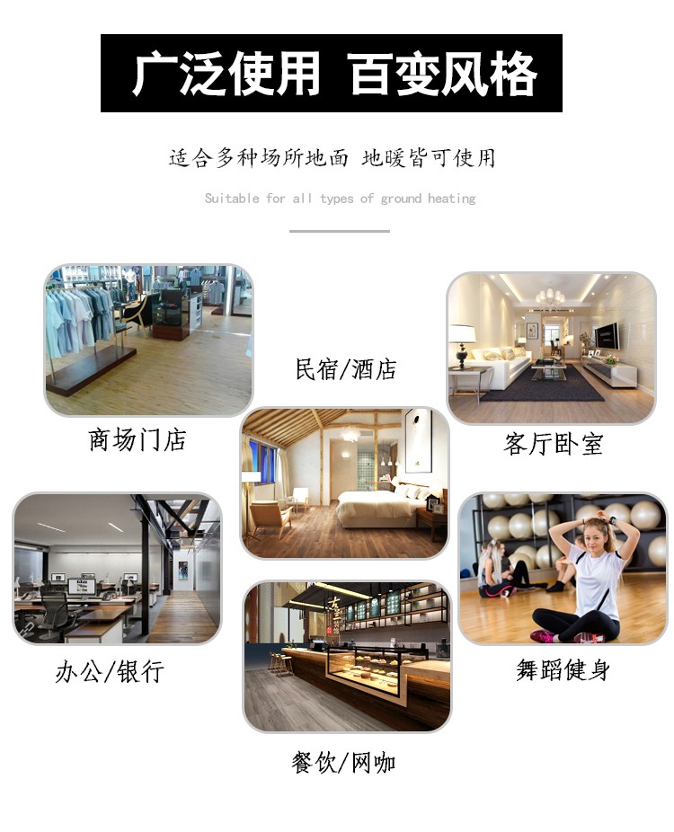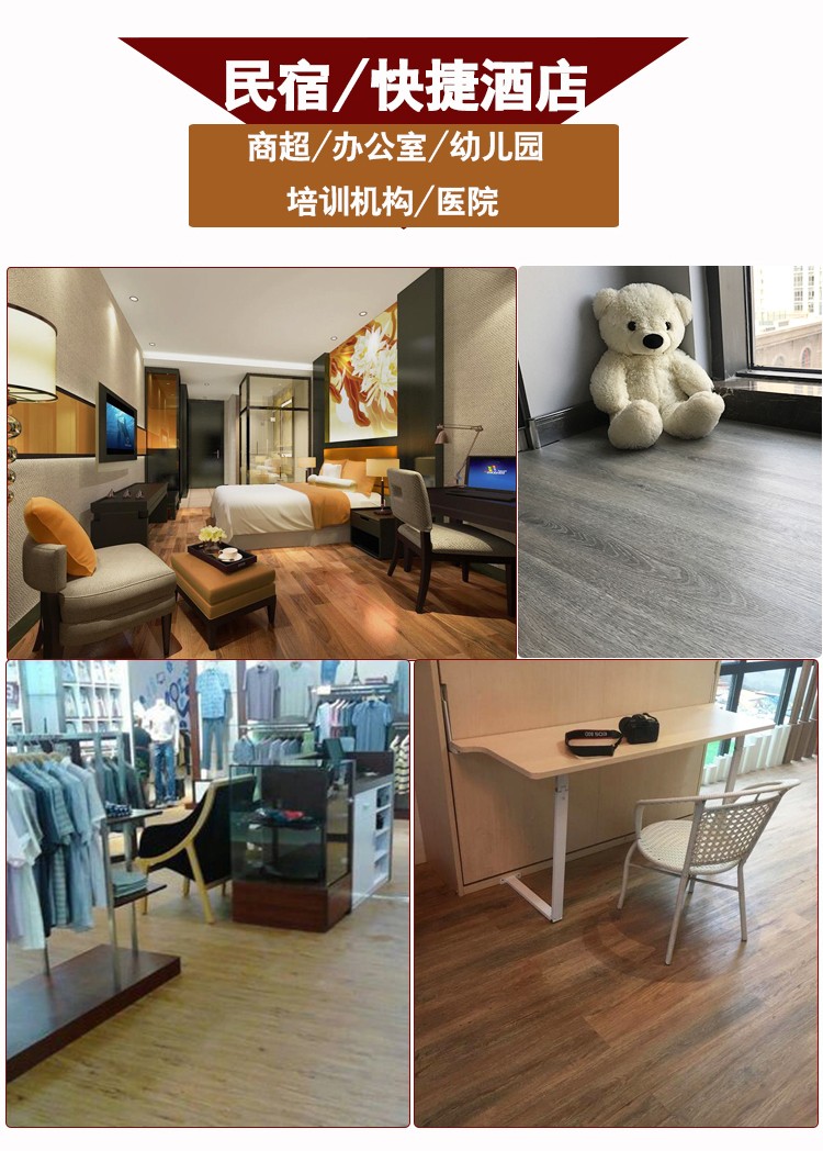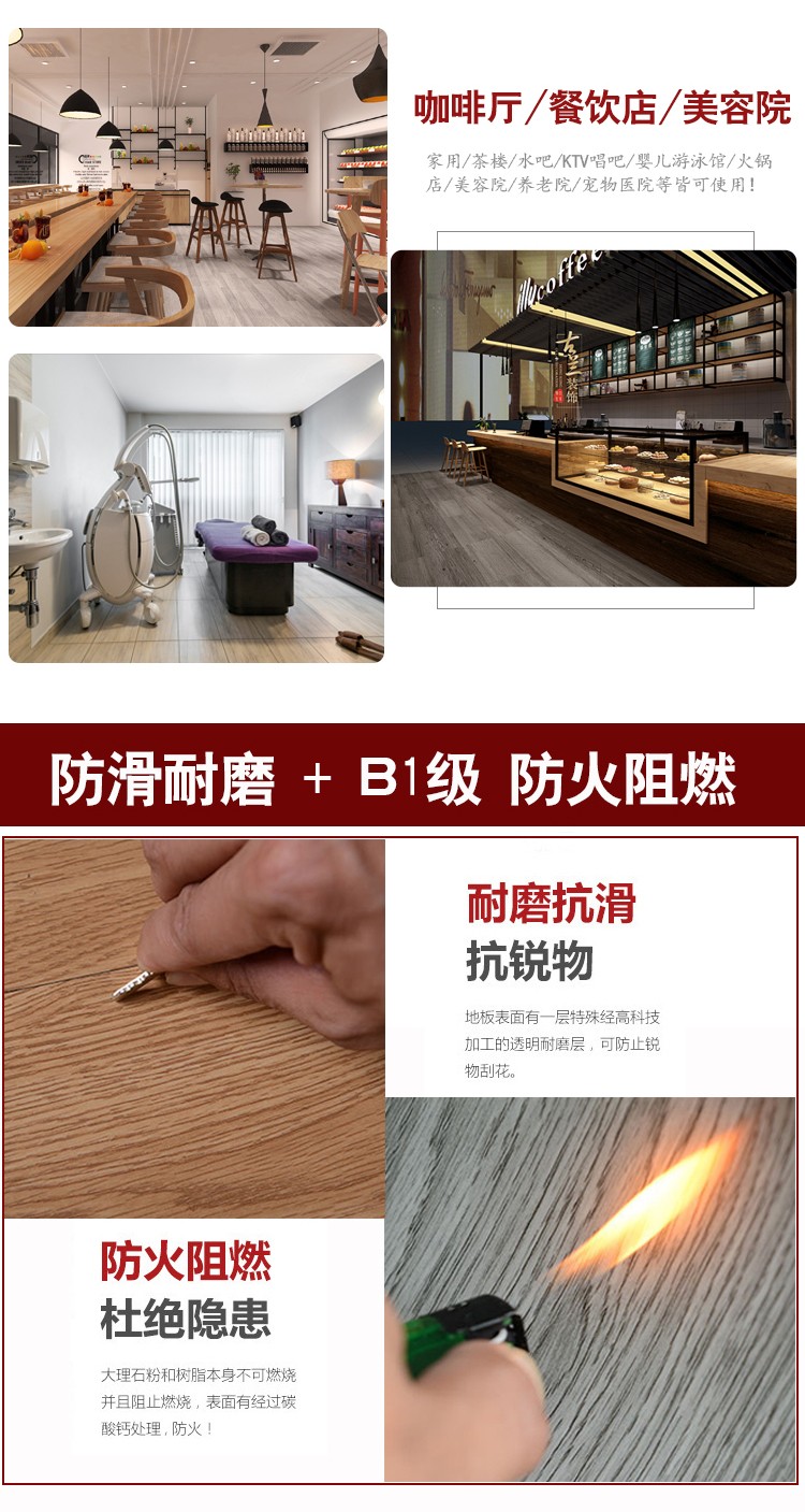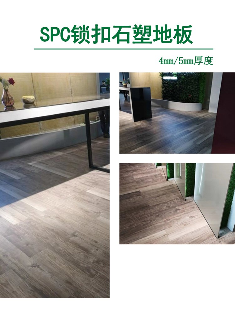 介紹:spc鎖扣石塑地板,又稱為pvc鎖扣地板,卡扣式免膠安裝 ,0甲醛環保安全 ,防水防滑,耐磨阻燃,特別合適於:酒店公寓,超市店鋪,家裝民宿,咖啡廳茶樓等場所,防火級別:B1級阻燃 ,耐磨度:T級耐磨,厚度:4mm/5mm,花紋:仿木紋,仿大理石紋,仿地毯紋