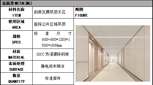 介紹:鋼製複合天花由鋼板+瓦楞組合而成,暗架結構,具有安裝便捷,板麵大,平整度高,完美搭配燈帶、通風設備帶,有多種組合選擇,適用於醫院公共區域吊頂